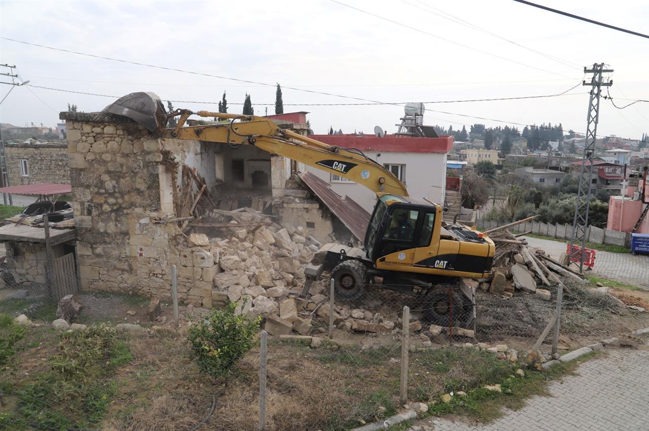 Akdeniz Belediyesi Zabıta Müdürlüğü ekiplerinin de destek verdiği yıkım öncesi, ilk olarak şerit çekilip çevre güvenliği sağlanarak yıkımın yapılacağı sokak ve caddeye yayaların ve araçların girişi önlendi. Sonrasında da ağır iş makinesi desteğiyle 2 katlı metruk yapının yıkımına başlandı.